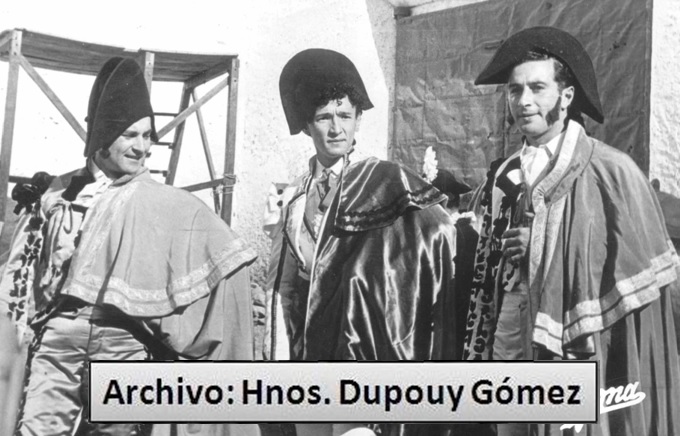 De izquierda a derecha: Antonio Bienvenida, César Girón y Cayetano Ordóñez, actuando en la primera Corrida Goyesca realizada en Ronda, el 17 de septiembre de 1954. Foto: Arjona. (Archivo: Hnos. Dupouy Gómez).