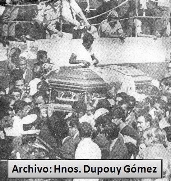 El cuerpo del inolvidable César Girón siendo conducido a hombros por sus hermanos en la Maestranza de Maracay ante las muestras de dolor de su pueblo que acudió a despedirle. Año 1971. (Archivo: Hnos. Dupouy Gómez).