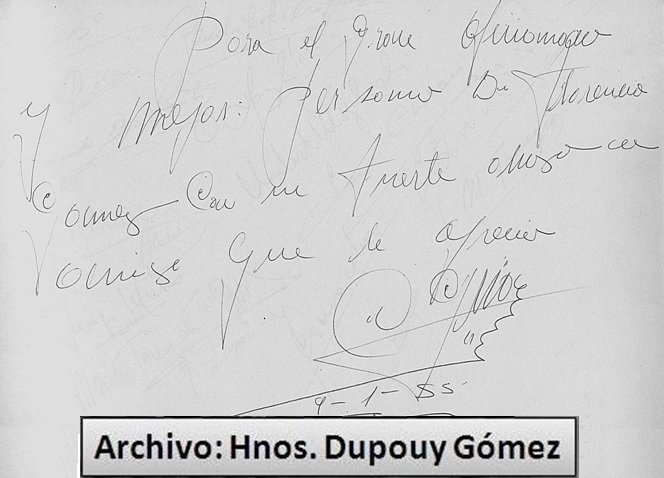 Dedicatoria a mi abuelo: “Para el gran aficionado y mejor persona Don Florencio Gómez con un fuerte abrazo su amigo que le aprecia”. César Girón. 9 de enero de 1955. (Archivo: Hnos. Dupouy Gómez).