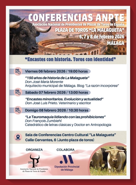 Durante los días 6, 7 y 8 de febrero, en la plaza de toros La Malagueta, la Asociación Nacional de Presidentes de Plazas de Toros de España (ANPTE), celebrará la XIV Asamblea General Nacional y será en la Sala de Conferencias del Centro Cultural del coso malagueño.