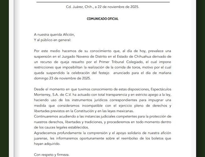 Por este medio hacemos de su conocimiento que, al día de hoy, prevalece una suspensión en el Juzgado Noveno de Distrito en el Estado de Chihuahua derivado de un recurso de queja resuelto por el Primer Tribunal Colegiado, el cual impone restricciones que imposibilitan la realización de la corrida de toros, motivo por el cual queda suspendido la celebración del festejo anunciado para el día de mañana domingo 23 de noviembre de 2025.
