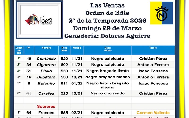 Este será el orden de lidia de los toros de Dolores Aguirre para el 2º festejo de la temporada 2026 a celebrarse este domingo 29 de Marzo, Domingo de Ramos, en la Monumental Plaza de Las Ventas. En el cartel se leen los nombres de Antonio Ferrera, Isaac Fonseca y Cristian Pérez -quien confirma su alternativa-. El festejo dará inicio a las 18:00 horas.